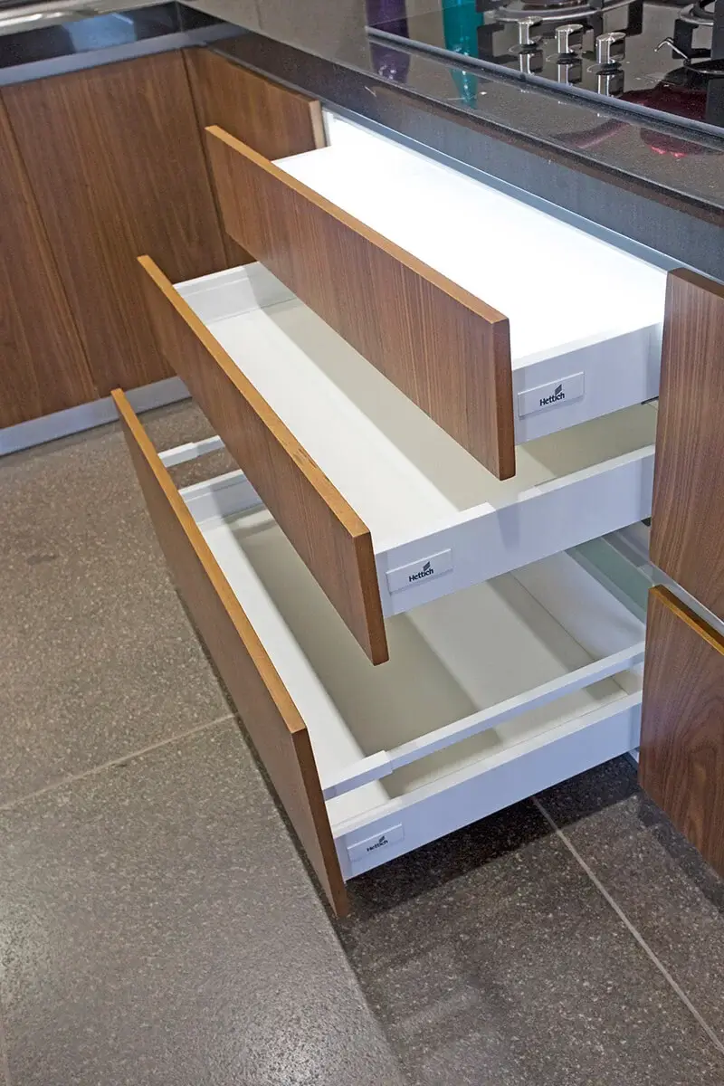 Cutlery drawers should be placed near the cooking and dining areas for convenience. Ideally, they should be below the countertop where food preparation happens.