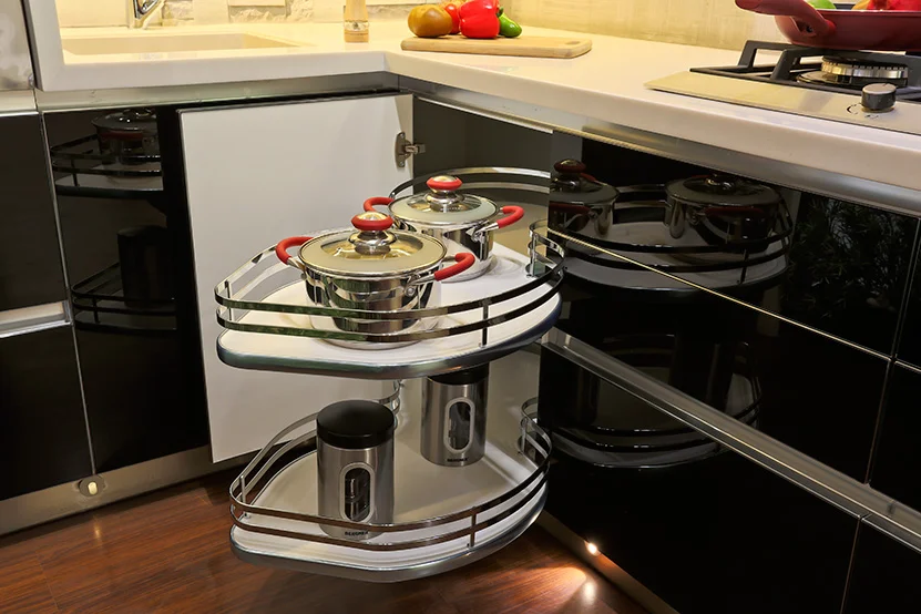 A magic corner is a smart storage solution for corner cabinets in a modular kitchen. It uses pull-out shelves or baskets to make the hard-to-reach space easily accessible.